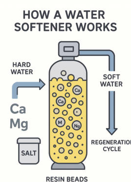 A water softener removes calcium and magnesium  and replaces them with sodium (Na⁺) or potassium (K⁺) ions through a process called ion exchange.